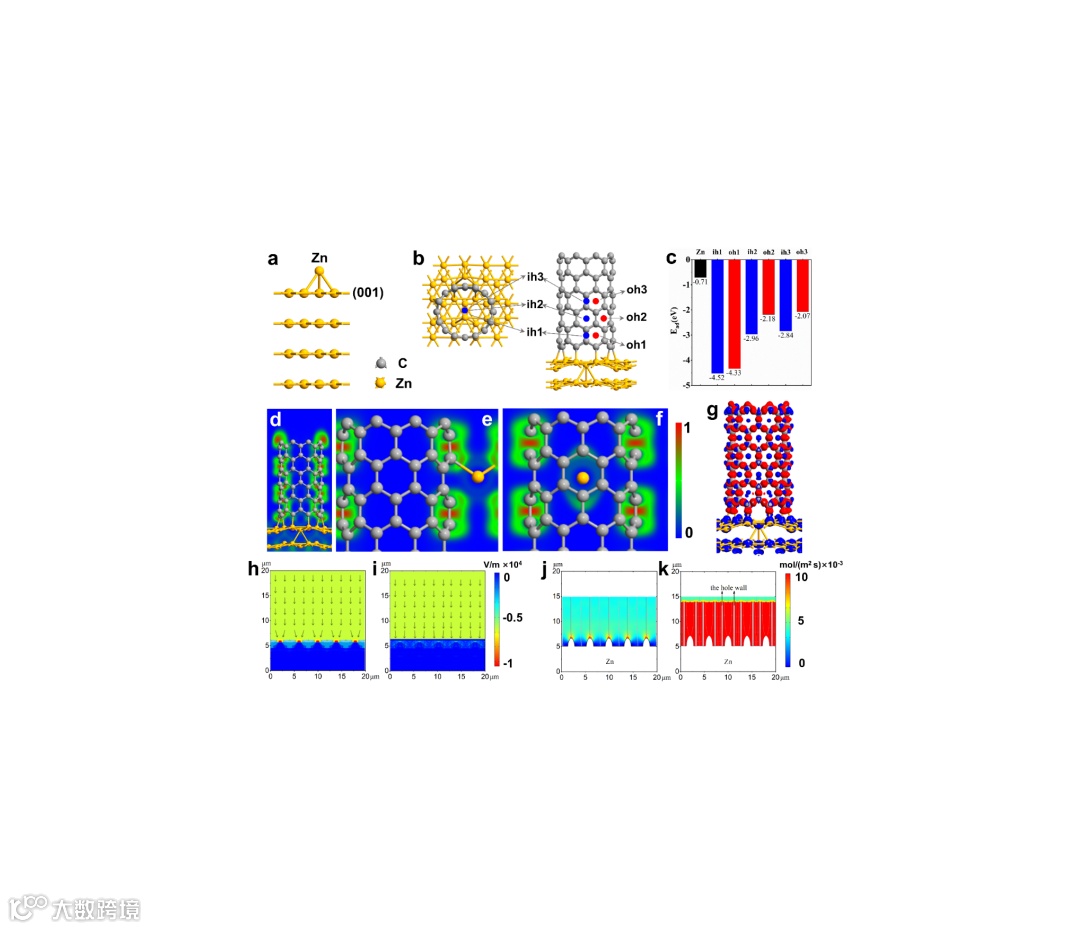 图2. 3D-NC界面层的理论计算与模拟。锌吸附在a)锌负极(002)面和b)3D-NC的DFT计算模型和c)相应的吸附能。d)锌吸附在3D-NC时的电子局域函数(ELF)。锌吸附在3D-NC e)oh3位点和ih3位点时的ELF。h,j)裸锌和i,k)3D-NC@Zn电极表面的电场模拟和Zn2+离子场模拟。