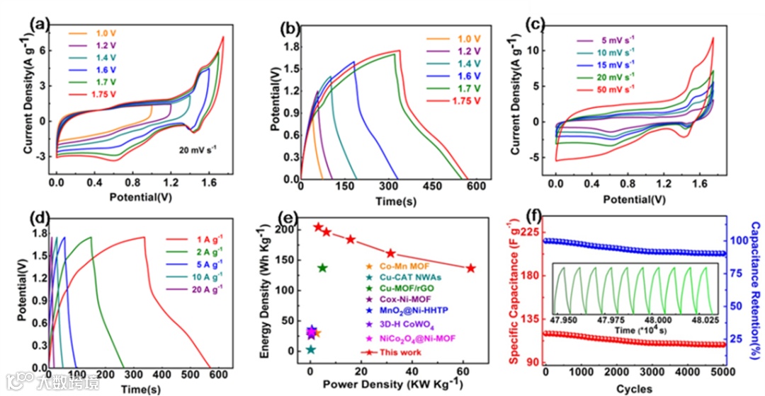 组装的简易超级电容器设备的最大工作电压窗口为1.75 V,且表现出良好的倍率性能。在3.15 KW Kg-1的功率密度下,可以实现204.31 Wh Kg-1的能量密度。此外,该设备还表现出了优异的循环稳定性,5000次充放电后,其电容保留率为90.3%。