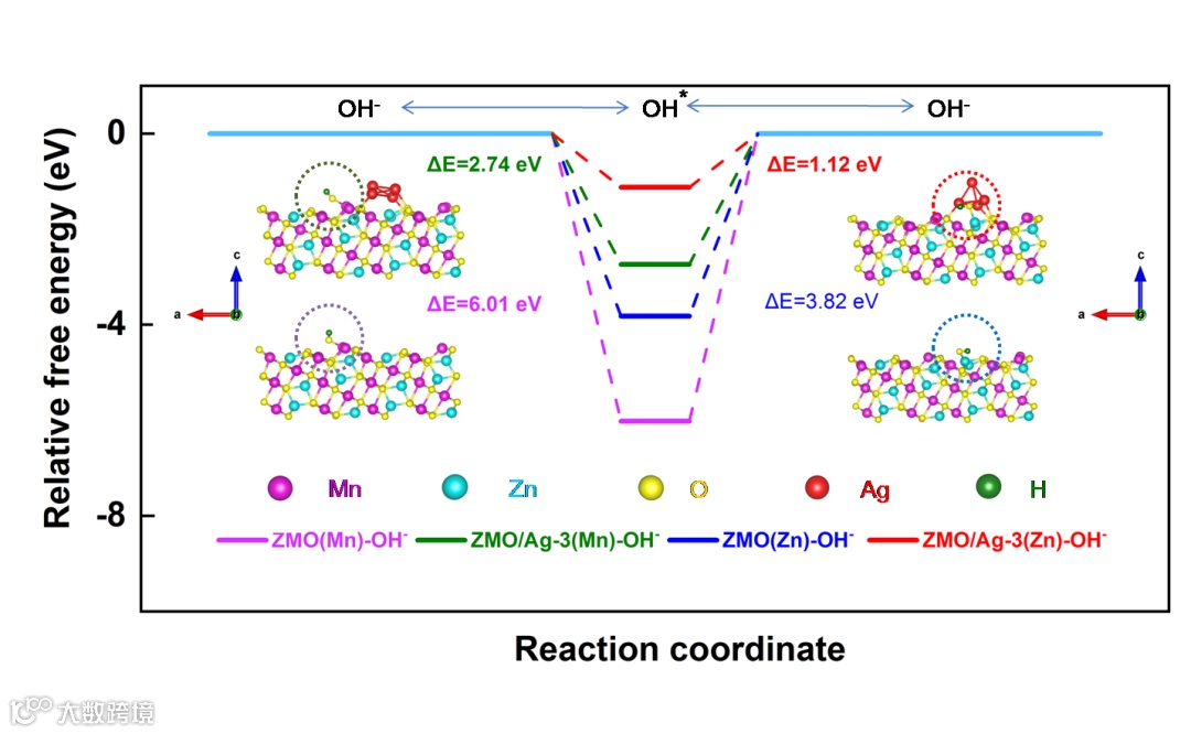 基于动力学分析,电容贡献主要来自于金属活性位点进行的氧化还原反应。因此,作者采用简化的计算策略,对金属活性位点(Zn、Mn)进行负载前后电化学反应势垒的计算,对比得到贵金属Ag纳米颗粒负载对电化学氧化还原反应阻力的减小。