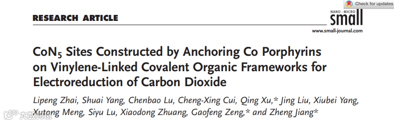 基于此,中科院上海高等研究院徐庆副研究员、曾高峰研究员,姜政研究员和中原工学院的翟黎鹏博士合作,在国际知名期刊Small上发表题为“CoN5 Sites Constructed by Anchoring Co Porphyrins on Vinylene-Linked Covalent Organic Frameworks for Electroreduction of Carbon Dioxide”的文章。该文章构建了基于烯烃链接COFs的CoN5催化剂活性位点,并在探索了其在电催化CO2还原中的研究。