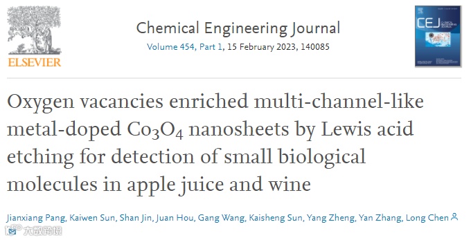 Jianxiang Pang, Kaiwen Sun, Shan Jin, Juan Hou, Gang Wang, Kaisheng Sun, Yang Zheng, Yan Zhang, Long Chen*, Oxygen vacancies enriched multi-channel-like metal-doped Co3O4 nanosheets by Lewis acid etching for detection of small biological molecules in apple juice and wine, Chemical Engineering Journal (2022) DOI: 10.1016/j.cej.2022.140085.