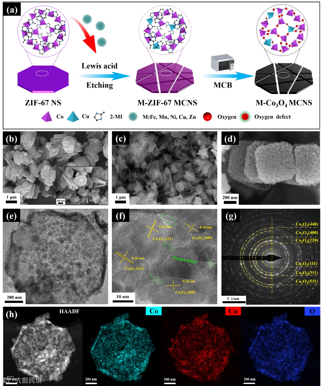图1 金属掺杂Co3O4制备示意图及Cu-Co3O4 MCNS的SEM, TEM, HRTEM, SAED, Mapping表征