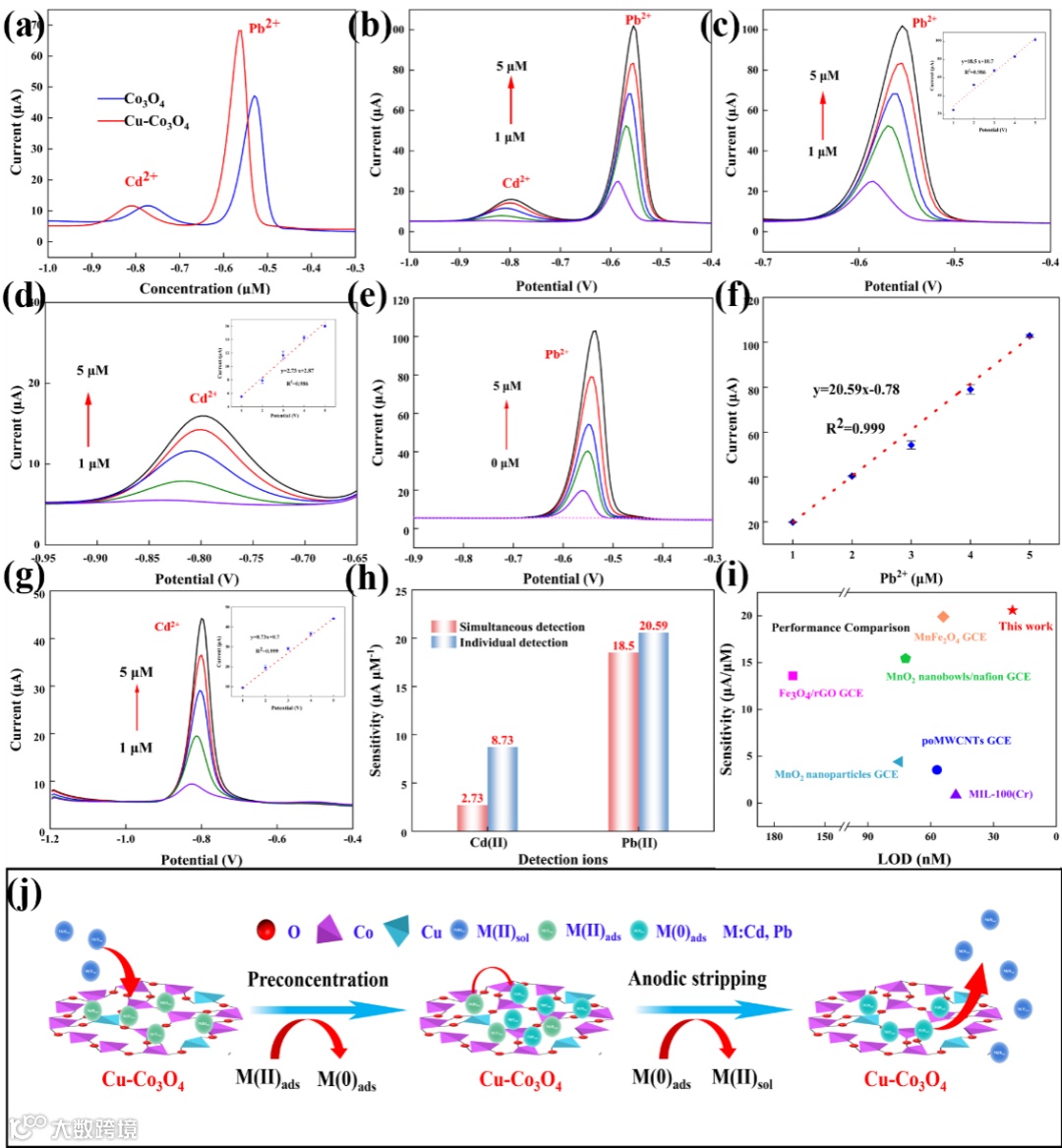 图4 Cu-Co3O4 MCNS同时和单独检测Cd(II)和Pb(II)以及检测机理