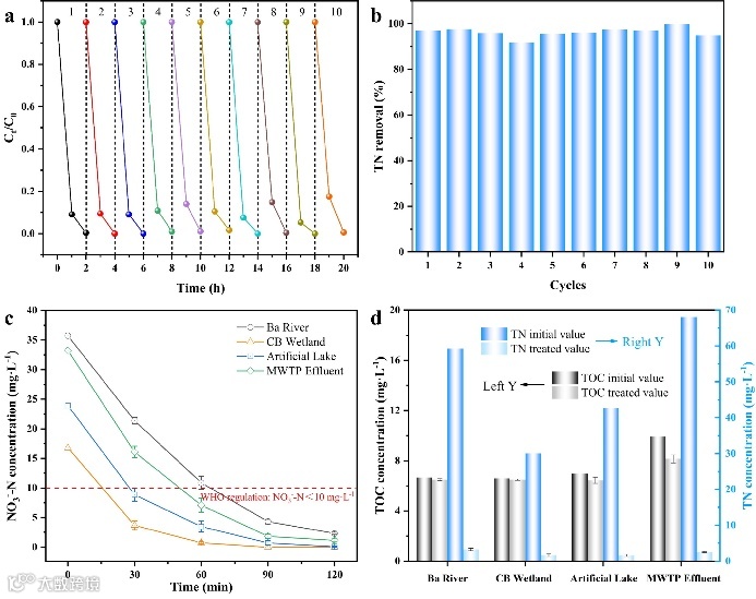 4. 在同时电氯氧化的辅助下,电催化系统可以将剩余中间产物氨转化成N2,实现N2择性96.81%。Cu2O/Cu NRs/CF电极处理实际硝酸盐污染废水的长期稳定性和低能耗使其具有广阔的应用前景。