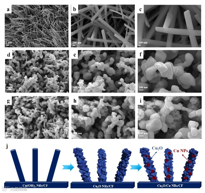 图1. Cu(OH)2→Cu2O→Cu2O/Cu演变过程中形貌变化。