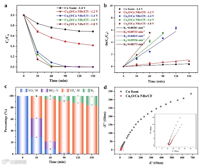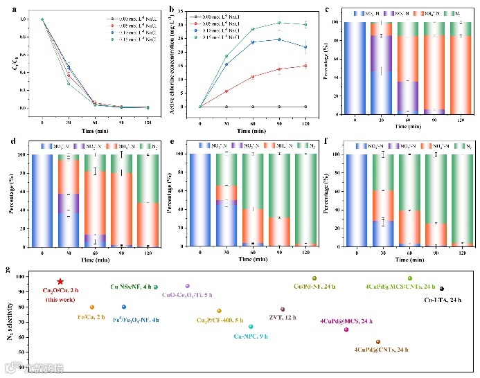 Cu2O/Cu NRs/CF阴极显示出优异的硝酸盐转化效率(100%)和快速的硝酸盐还原动力学(0.04815 min-1),无亚硝酸盐积累。虽然氨是主要的还原产物,但是协同电氯氧化作用可以有效地将其转化成氮气,最终实现96.81%的N2选择性。