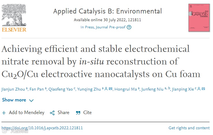 Jianjun Zhou, Fan Pan, Qiaofeng Yao, Yunqing Zhu*, Hongrui Ma, Junfeng Niu, Jianping Xie*. Achieving efficient and stable electrochemical nitrate removal by in-situ reconstruction of Cu2O/Cu electroactive nanocatalysts on Cu foam, Applied Catalysis B: Environmental, 2022, 121811.
