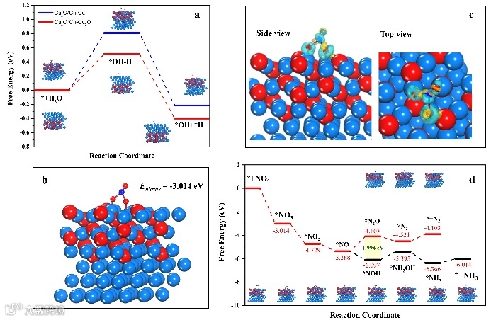 受此启发,Cu2O作为电催化剂可能具有与贵金属电极(如Pd、Pt、Rh等)类似的H2O吸附和解离特性。通过H2O + e- → H* + OH−,可以产生足够的H*,同时抑制析氢的负面影响,为NO3−RR的实现提供了良好的基础。然而,目前的研究大多集中在金属Cu与其他辅助金属的协同作用上,关于Cu2O在NO3−RR过程中的作用鲜有报道。