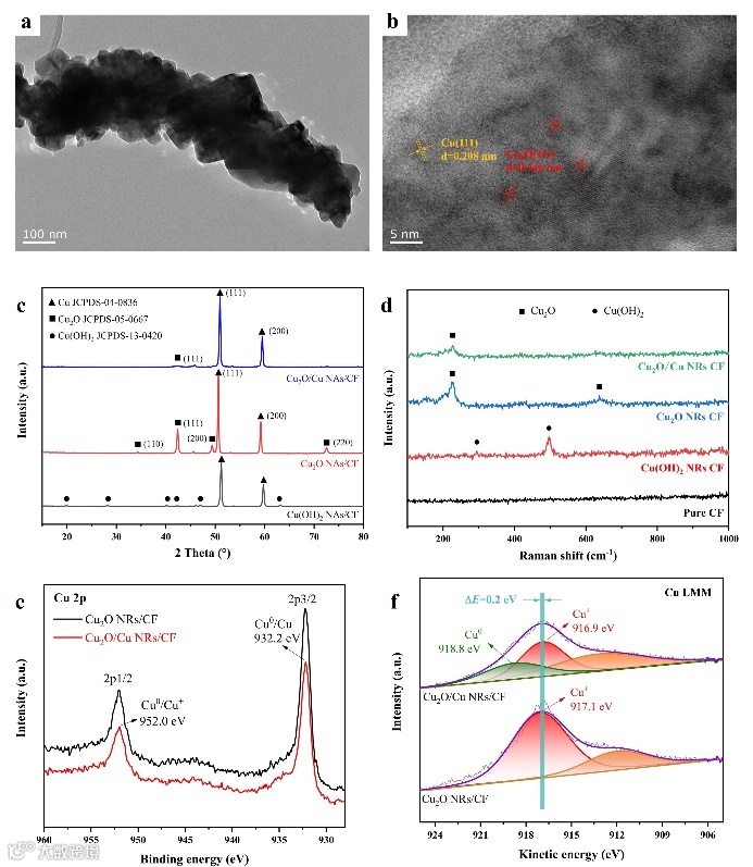 2. 含富电子Cu2O位点的Cu2O/Cu NRs/CF阴极具有优异的原子H*供应性能,在电化学NO3−RR过程中表现出显著的电催化性能和快的还原动力学(0.04815 min-1)。