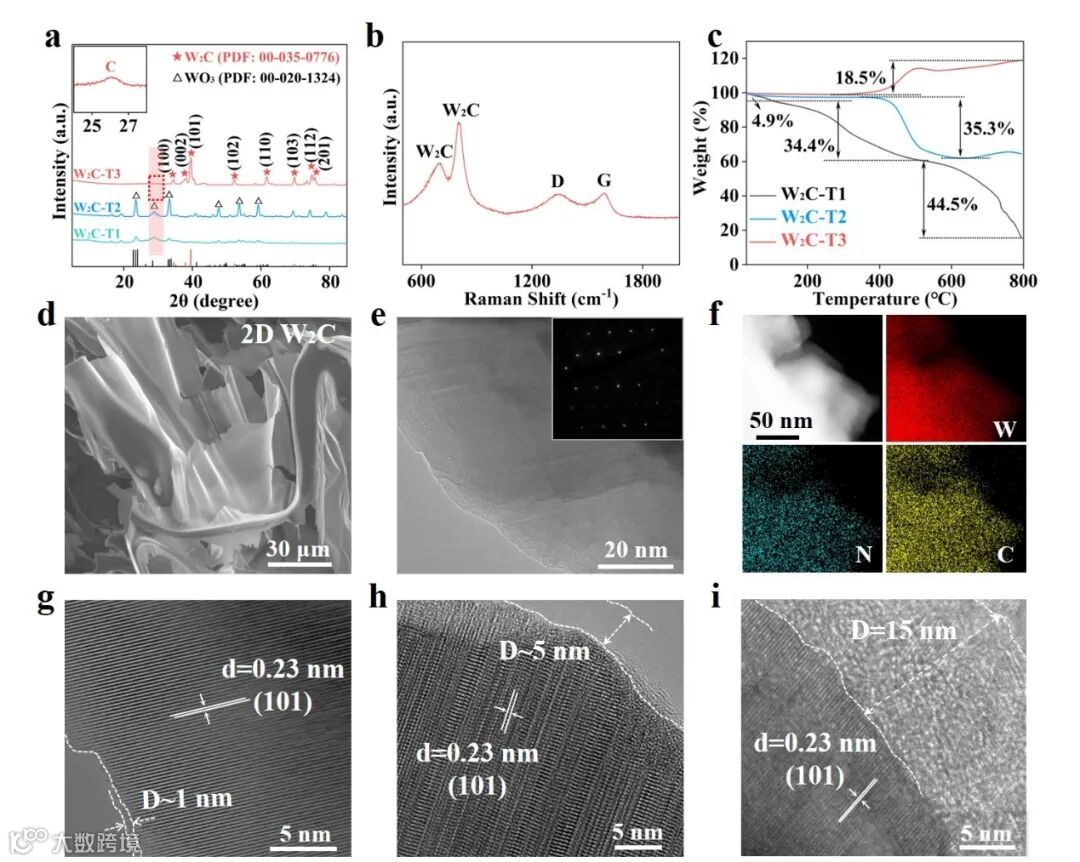 要点二:以二维碳化钨的合成为例,产物的晶体结构为六方晶相的W2C,形貌为二维超薄纳米片,具有大面积的高质量晶格条纹。