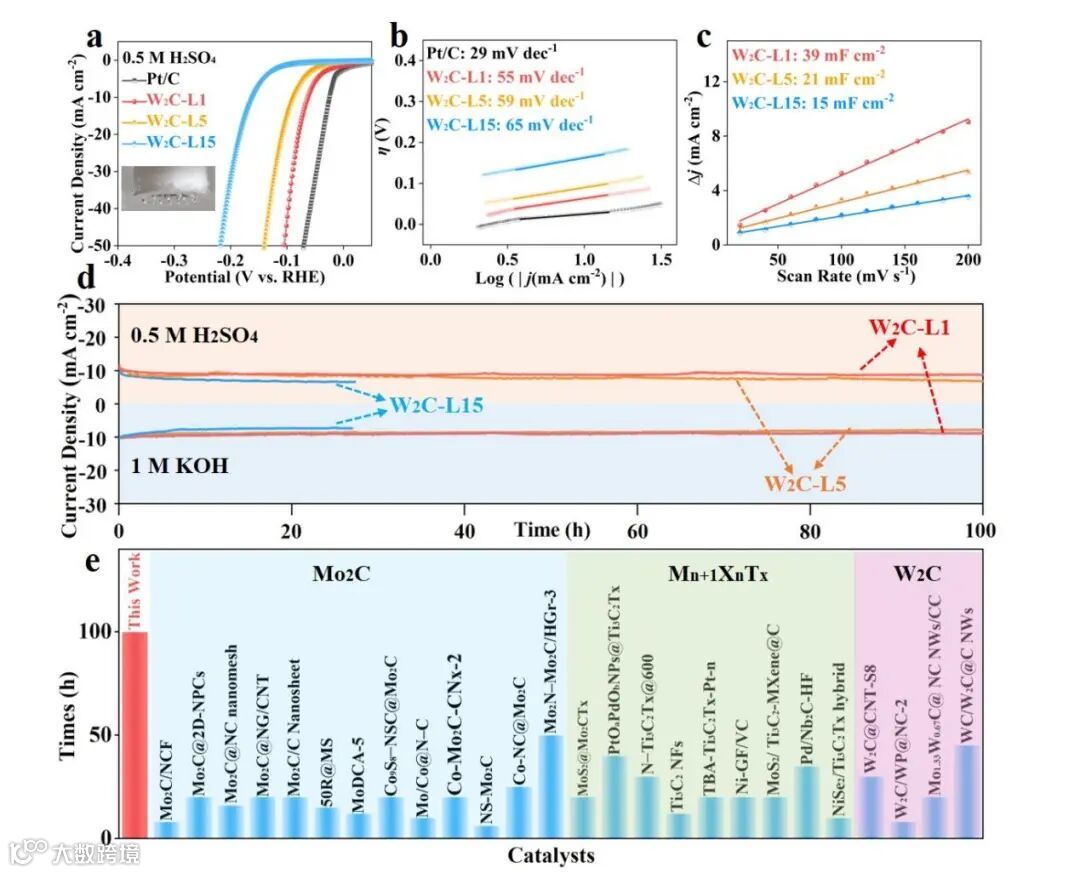 要点五:所制备的超薄碳层(1 nm)修饰的2D W2C在电催化析氢反应中能展现优异的催化活性与超长循环寿命(100 h)。