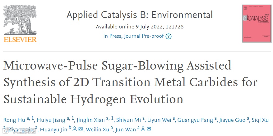 Rong Hu#, Huiyu Jiang#, Jinglin Xian#, Shiyun Mi, Liyun Wei, Guangyu Fang, Jiayue Guo, Siqi Xu, Ziyang Liu, Huanyu Jin*, Weilin Xu, Jun Wan*, Microwave-Pulse Sugar-Blowing Assisted Synthesis of 2D Transition Metal Carbides for Sustainable Hydrogen Evolution. Applied Catalysis B: Environmental 2022, 121728