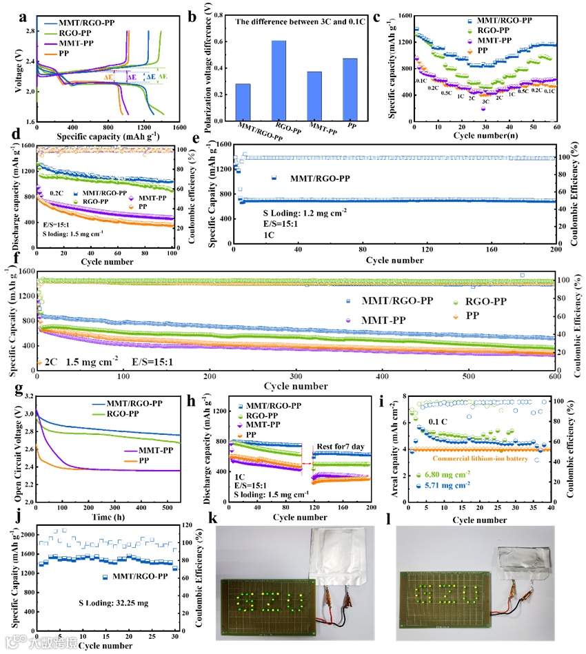 由于MMT/RGO对多硫穿梭抑制的良好作用,相应的锂硫电池在0.1C时初始放电容量远高于其他对比电池,且表现出优异的倍率性能,当电流密度增加到3C时,基于MMT/RGO的电池仍展现良好长电压平台且极化最小,而基于RGO-PP、MMT-PP和原始PP电池极化明显,这也进一步表明MMT/RGO有效地促进了LiPSs向Li2S的转化,提高了硫利用率。
