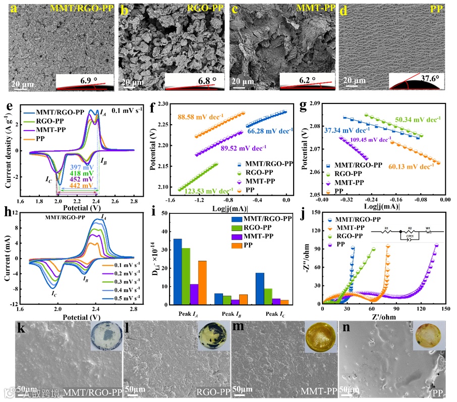 接着,组装了基于以上修饰隔膜的锂硫电池,循环伏安测试、Tafel曲线、交流阻抗测试结果显示基于MMT/RGO阻挡层的电池具有最快的LiPSs转化反应动力学、Li+扩散系数(DLi+)最高、更小极化电压、较低的电荷转移电阻,这将有利于对多硫穿梭的抑制。