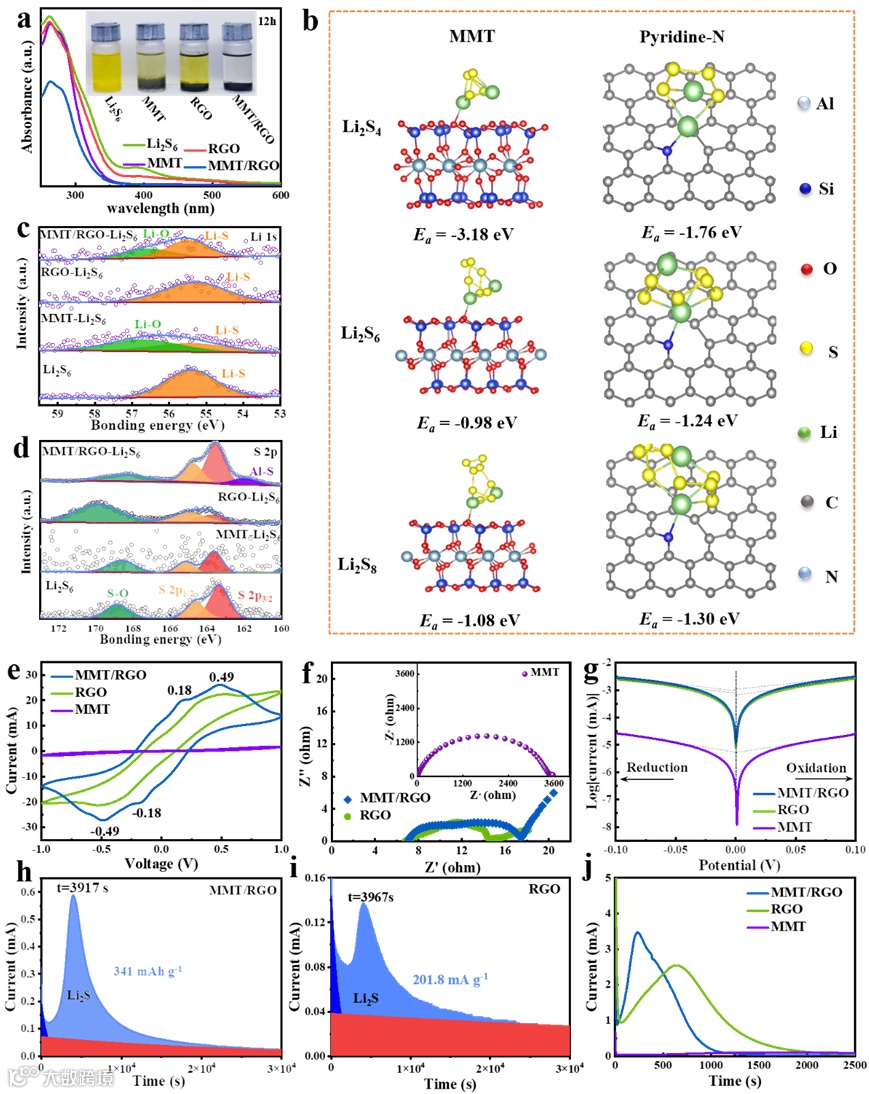 如图3所示。吸附实验和DFT计算结果均表明该二维异质结构(MMT/RGO)对于多硫化物的吸附能力上,要明显优于与其他单组分或物理混合组分。该异质结对多硫化物的化学吸附能力也得到了XPS测试结果的证实。另外,相应电池的循环伏安测试、阻抗谱图、Tafel曲线、Li2S沉积实验及溶解实验结果均证明MMT/RGO能有效促进多硫化物的转化动力学。