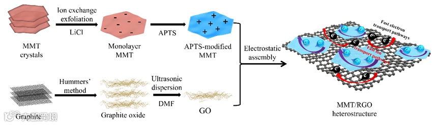 粘土是一种资源丰富、成本低廉的层状硅酸盐材料,具有良好的离子吸附和传输能力,极易通过液相法剥离为二维粘土片层。作者通过离子交换法制备得到单片层的锂基蒙脱土(如制备流程图1),采用三氨丙基三乙氧基硅烷对其进行表面电荷改性,使其成为表面带有正电荷,接着引入氧化石墨烯,通过两种二维材料的静电组装,以及后续的高温还原,最终制得了二维蒙脱土/氮掺杂石墨烯异质结。将样品调制成浆料涂覆于商用PP隔膜表面构筑阻挡层。