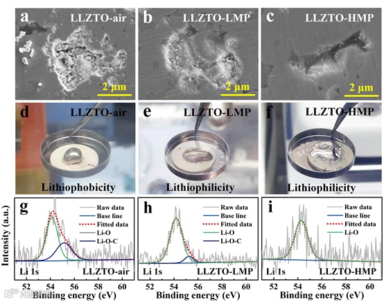 图3. 清洗前后LLZTO的表面形貌及组分表征。(a) LLZTO-air,(b) LLZTO-LMP,(c) LLZTO-HMP的表面形貌。熔融锂与(d) LLZTO-air、(e) LLZTO-LMP和(f) LLZTO-HMP之间润湿行为的数码照片。(g) LLZTO-air,(h) LLZTO-LMP和(i) LLZTO-HMP在Li 1s上的XPS结果。