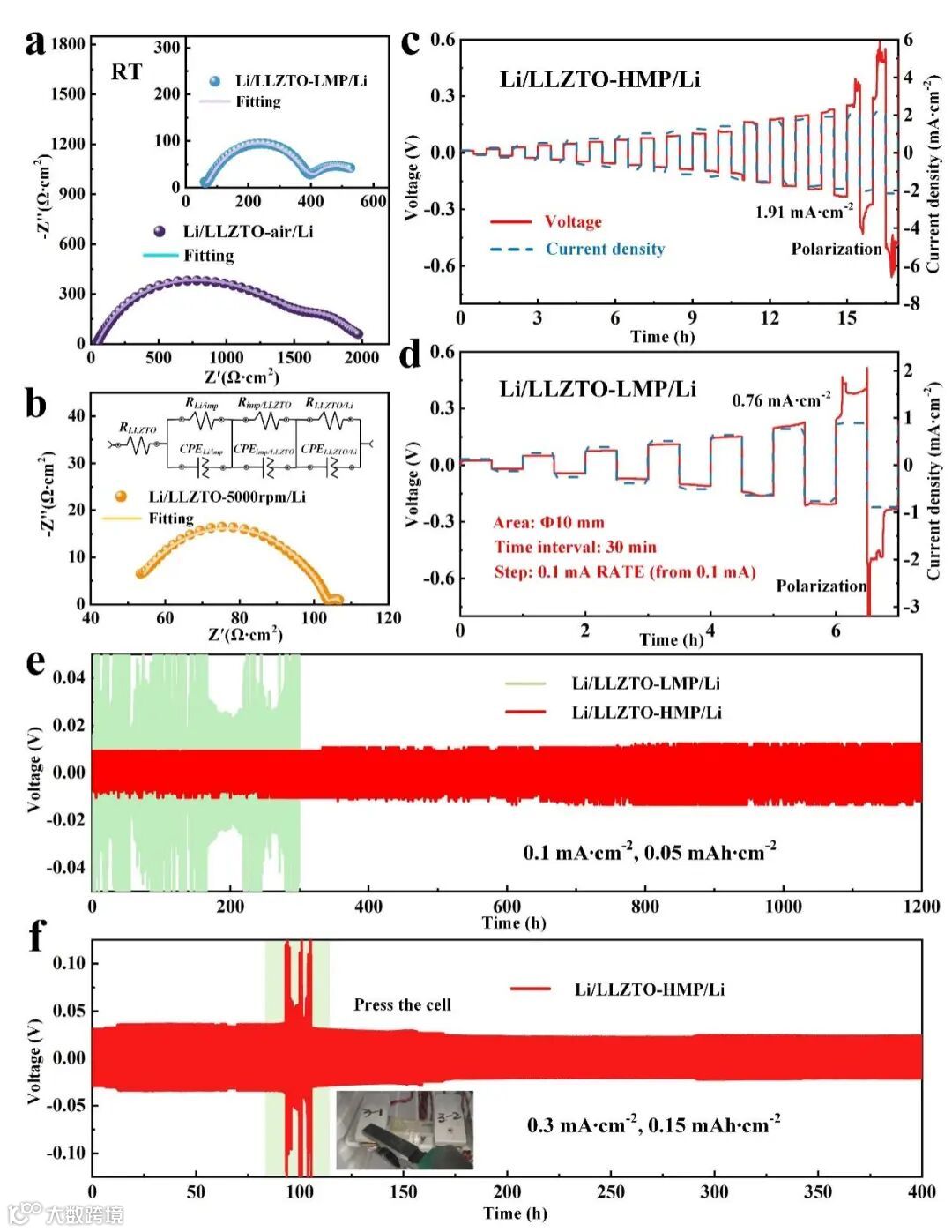 未抛光的LLZTO-air界面电阻为~1000 Ω·cm2,表现出较差的LLZTO/Li界面。Li/LLZTO-LMP/Li对称电池的界面电阻由于高效的抛光过程而降低到279.74 Ω·cm2。虽然LLZTO-LMP表现出一定的亲锂性,但界面电阻仍然太大,无法达到锂剥镀工艺的优越稳定性。