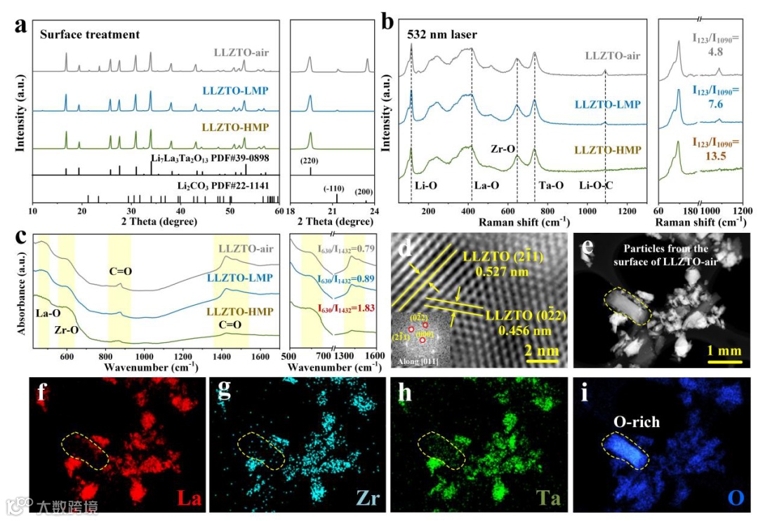 对未清洗(LLZTO-air)、低转速常规清洗(LLZTO-LMP)以及高速清洗(LLZTO-HMP)三种样品表面进行物相表征。XRD图谱显示三种样品均保持纯立方相,且Li2CO3杂质存在于LLZTO-air和LLZTO-LMP之中,而LLZTO-HMP电解质表面未观察到Li2CO3杂质峰。