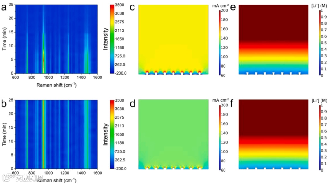 图2.(a-b)原位拉曼测试。(c-d)不同沉积动力学下的电流分布以及离子浓度分布的模拟结果。