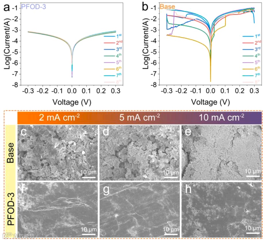 图3.(a-b)塔菲尔曲线。(e-h)不同电流下锂沉积形态。