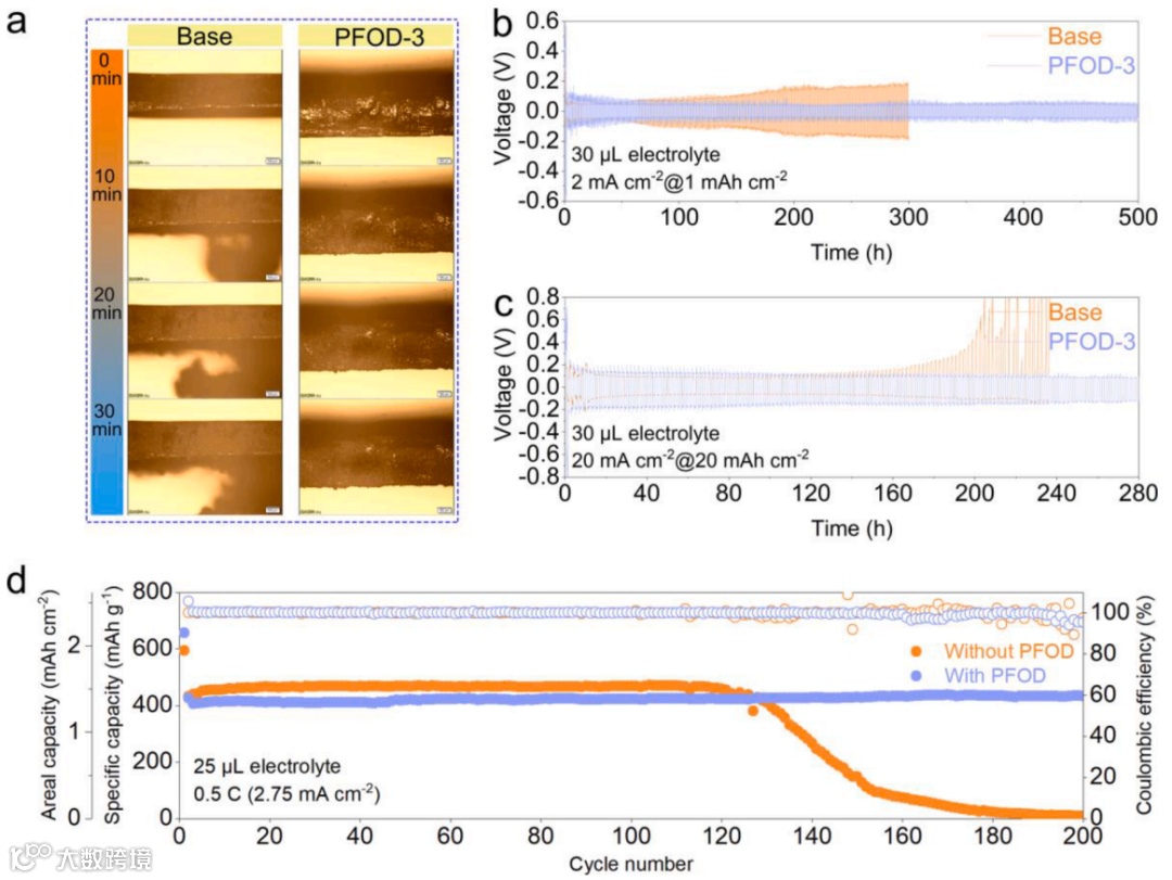 该工作中,作者通过在电解液中添加氟碳表面活性剂作为添加剂,缓解电极界面处的浓差极化,成功实现了锂枝晶的抑制。在锂沉积过程中,如果消耗的锂离子不能及时得到补充,这将在锂金属-电解液界面处产生较大的浓度梯度,并驱动锂枝晶不断向电解液体相生长,造成电池性能恶化。