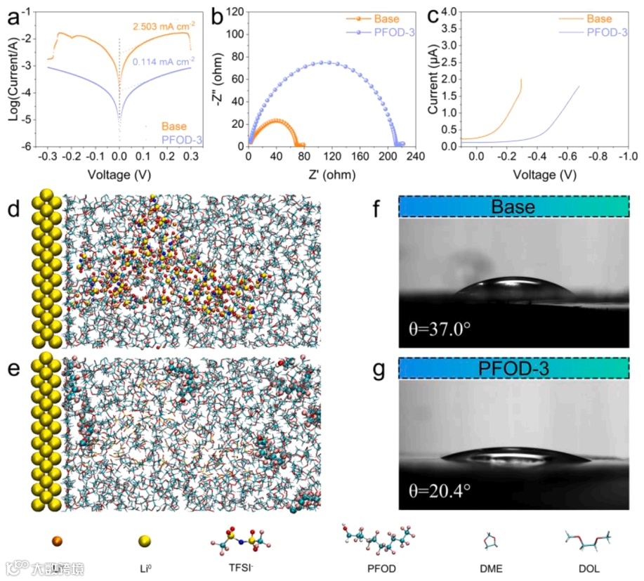 图1. (a) 塔菲尔曲线。(b)对称电池的EIS曲线。(c)LSV曲线。(d-e)电解液分子动力学模拟结果的快照。(f-g)电解液对锂金属的接触角。
