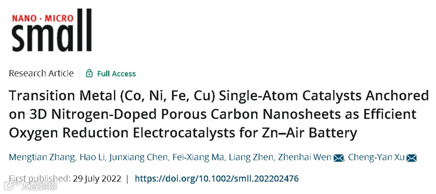 基于此,来自哈尔滨工业大学(深圳)的徐成彦教授与中国科学院福建物质结构研究所的温珍海教授合作,在国际期刊Small上发表了题为“Transition Metal (Co, Ni, Fe, Cu) Single-Atom Catalysts Anchored on 3D Nitrogen-Doped Porous Carbon Nanosheets as Efficient Oxygen Reduction Electrocatalysts for Zn–Air Battery”的文章。