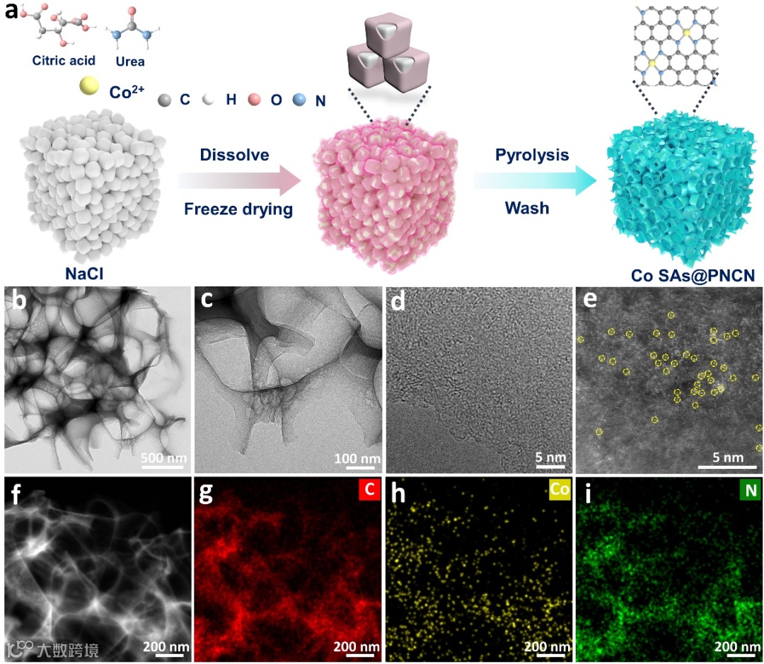 图2. Co SAs@PNCN的合成示意图和形貌表征