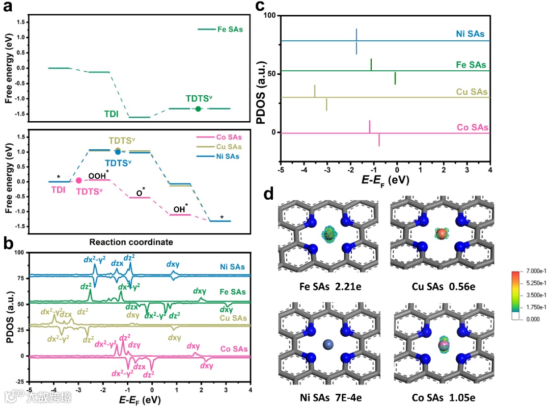 DFT计算预测,四种过渡金属单原子催化剂的本征ORR活性遵循Co > Fe > Ni ≈ Cu的趋势,其中Co单原子由于最佳的自旋密度,具有最佳的ORR活性。