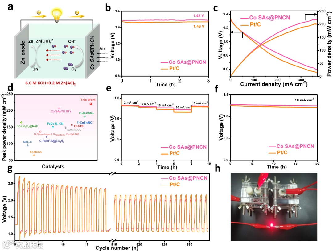 图6. Co SAs@PNCN和Pt/C作为阴极催化剂组装的锌空气电池性能