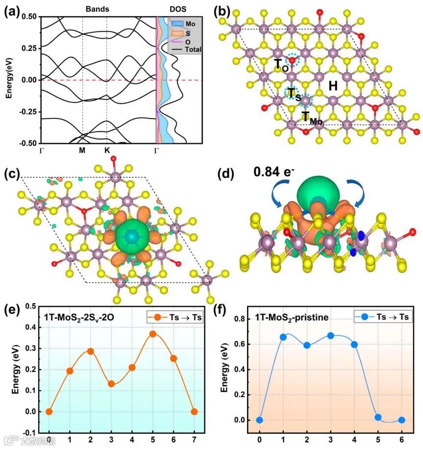利用第一性原理计算分析了1T相MoS2中的缺陷态和Na+离子的扩散行为。由于高温退火使-OH基团脱氢实现了O掺杂。对氧掺杂的1T相MoS2的电子能带结构和态密度进行了计算,结果说明O占据S空位后,1T相MoS2表现出良好的导电性。