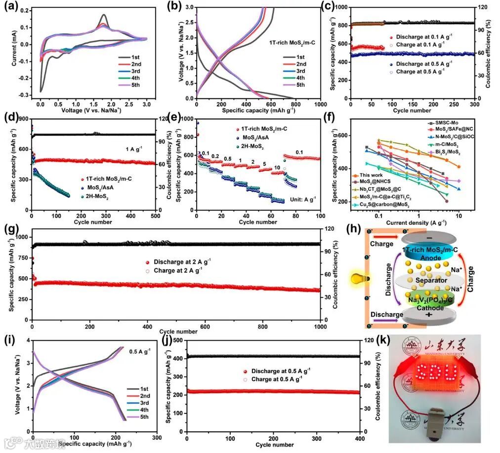在0.1 A g−1循环80个周期后比容量高达557 mAh g−1,甚至在2.0 A g−1的大电流密度下循环2000个周期后可逆比容量仍然维持在364 mAh g−1;在1T-rich MoS2/m-C//NaV2(PO4)3/C钠离子全电池中,在0.5 A g−1循环400个周期后可逆比容量仍达到215 mAh g−1。