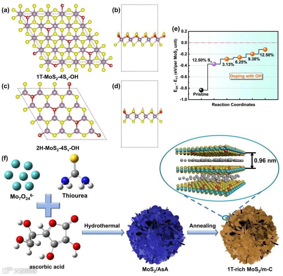 图1. -OH掺杂MoS2的理论计算以及1T-rich MoS2/m-C复合材料的合成示意图