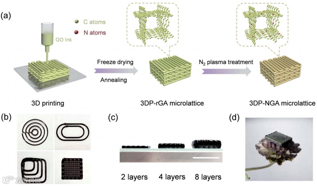 图1. (a)3D打印氮掺杂石墨烯微网格气凝胶(3DP-NGA)钠金属负极宿主的制备示意图。(b-d)3D打印电极的可设计形状和厚度展示以及石墨烯气凝胶电极的极轻的演示。