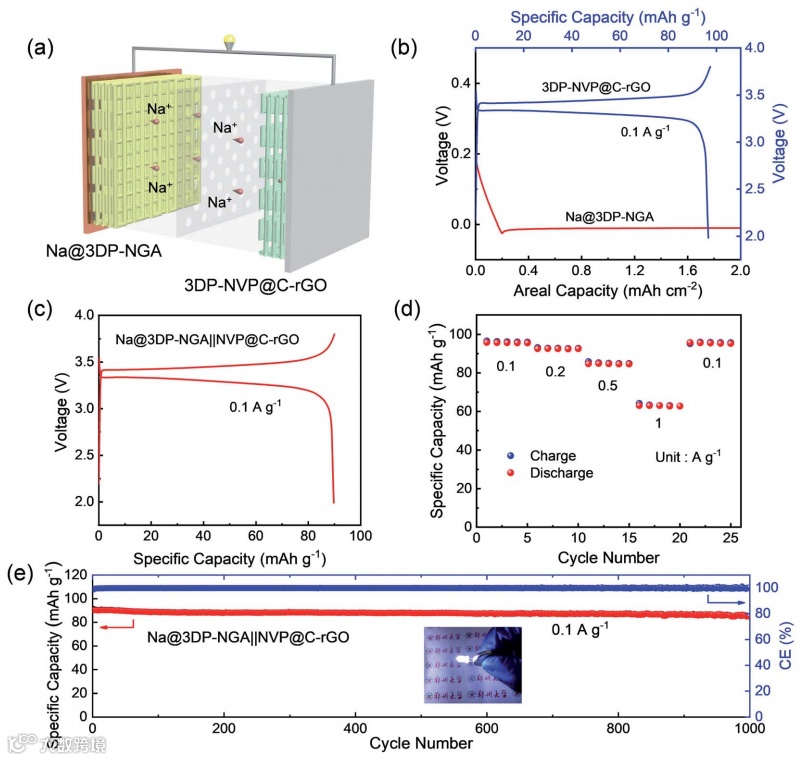 图6. Na@3DP-NGA钠金属负极匹配3D打印碳包覆磷酸钒钠-rGO复合正极的示意图和电化学性能。