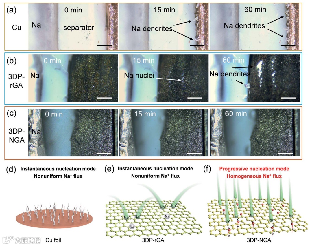 图5. (a-c)原位光学显微观察钠钠金属在3DP-NGA、3DP-rGA和Cu箔上的电沉积行为和(d-f)钠成核模式示意图。