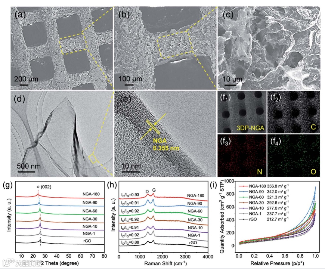 图2. 3DP-NGA的(a-c)SEM图像和(d, e)TEM图像以及(f)能谱图。3DP-rGO,NGA-1,NGA-10,NGA-30,NGA-60,NGA-90,NGA-180的XRD,Raman和BET图。