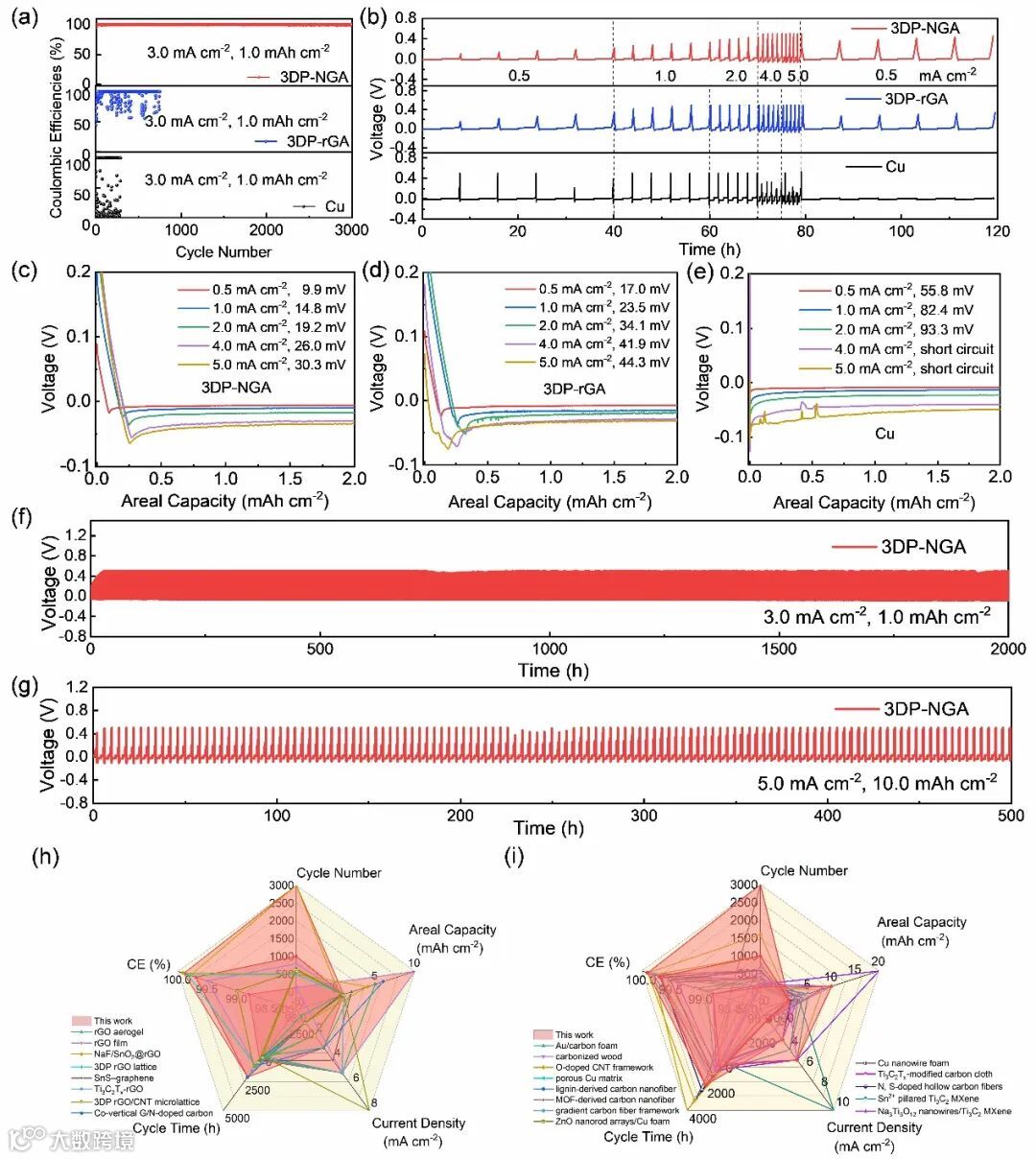 图4. (a-g)3DP-NGA、3DP-rGA和Cu电极的电化学性能测试。(h, i)该工作与石墨烯基钠金属宿主和其他具有代表性的钠金属负极性能对比。