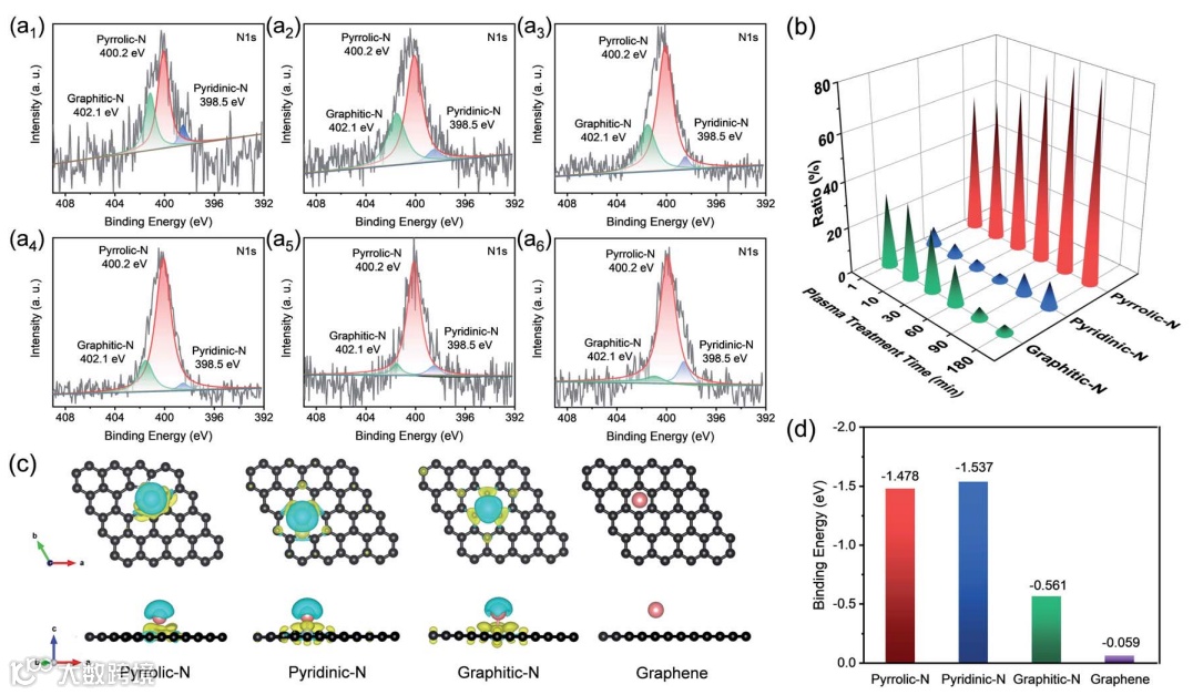 图3. (a, b)3DP-NGA的氮掺杂构型的XPS表征和(c, d)DFT结合能计算结果。