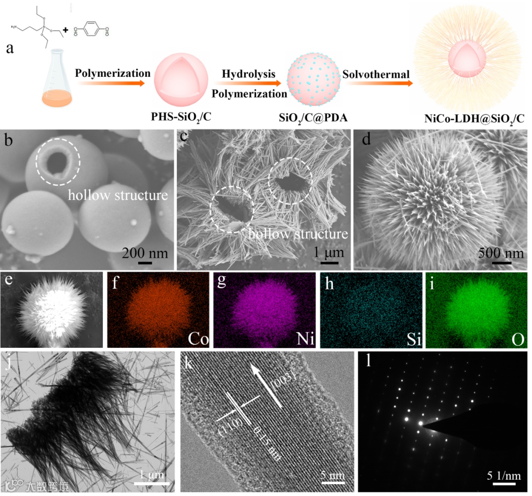 图2. NiCo-LDH@SiO2/C的(a)制备过程示意图,(b)SiO2/C@PDA的SEM,(c-d)NiCo-LDH@SiO2/C的SEM,(e-i)及对应的元素分布图像,(j)NiCo-LDH@SiO2/C的TEM,(k)NiCo-LDH@SiO2/C的HRTEM,(l)NiCo-LDH@SiO2/C的SAED。