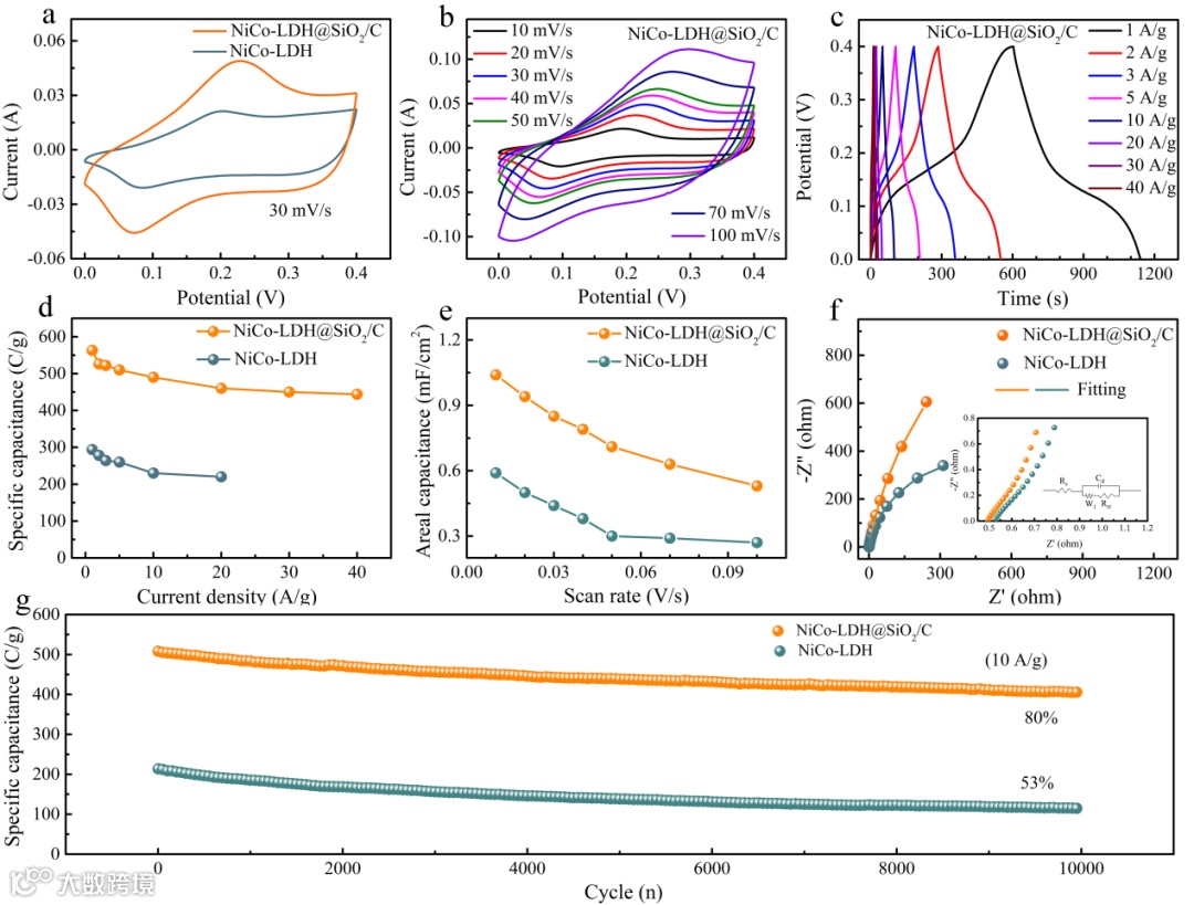 图4. NiCo-LDH@SiO2/C和NiCo-LDH的电化学性质。(a)在30 mV/s下的CV曲线,(b) NiCo-LDH@SiO2/C在不同扫描速率下CV曲线,(c)NiCo-LDH@SiO2/C在不同电流密度下的GCD曲线,(d)在不同放电电流下的比电容,(e)不同扫描速率下的面积电容,(f) EIS曲线,(g)NiCo-LDH@SiO2/C在10 A/g电流密度下的循环性能曲线。