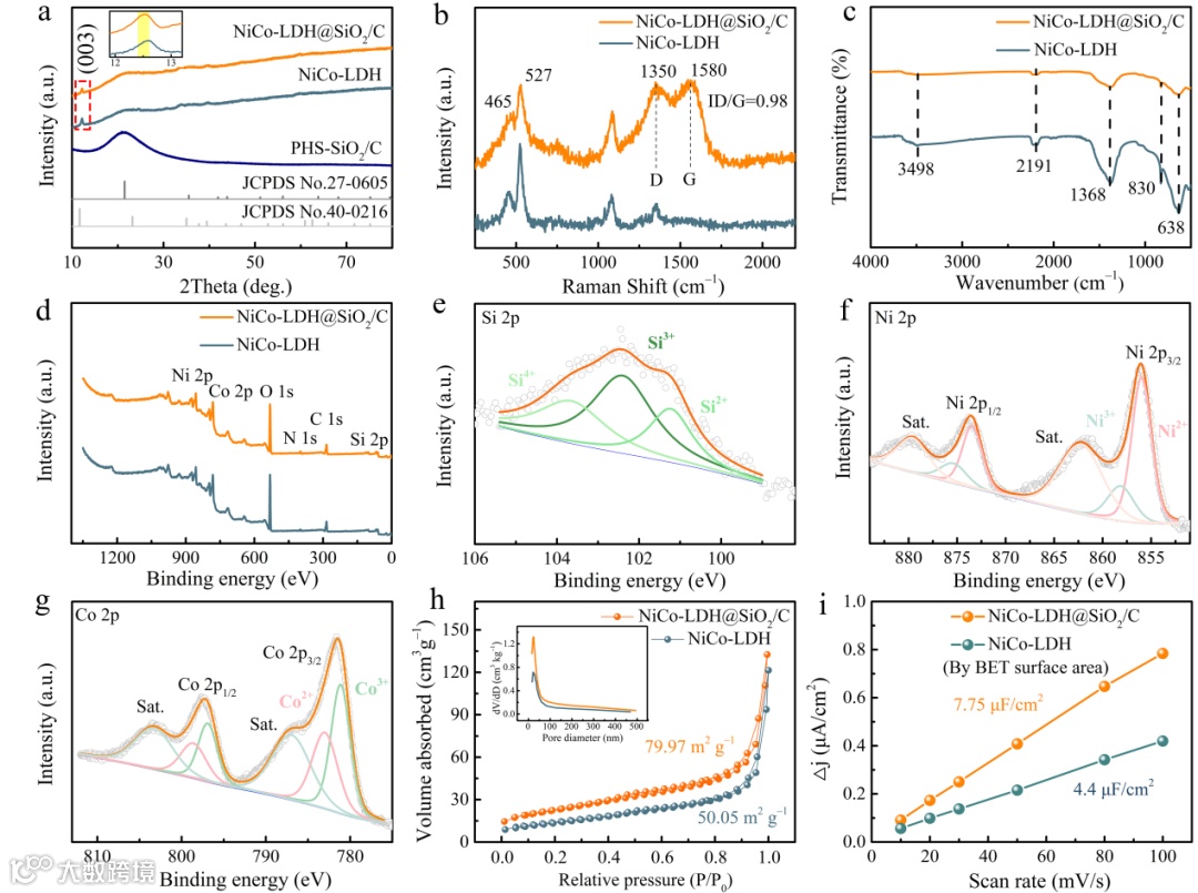 图3. NiCo-LDH@SiO2/C和NiCo-LDH的结构表征。(a)XRD,(b)Raman,(c)FT-IR,(d)XPS广谱,(e)Si 2p,(f)Ni 2p,(g)Co 2p XPS图谱,(h)BET,(i)CDL。