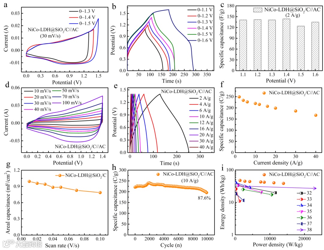 图5. NiCo-LDH@SiO2/C//AC不对称超级电容器的电化学性能。(a)不同电压范围的CV曲线,(b)不同电压范围的GCD曲线,(c)不同电压窗口的比电容,(d)不同扫描速率下的CV曲线,(e)不同电流密度的GCD曲线,(f)不同电流密度下的比电容,(g)不同扫描速率下的面积电容,(h)循环性能图,(i)能量密度和功率密度对比图。