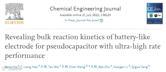 基于此,来自上海理工大学的郝亮教授与济南大学的魏涛教授合作,在国际知名期刊Chemical Engineering Journal上发表题为“Revealing bulk reaction kinetics of battery-like electrode for pseudocapacitor with ultra-high rate performance”的研究文章。