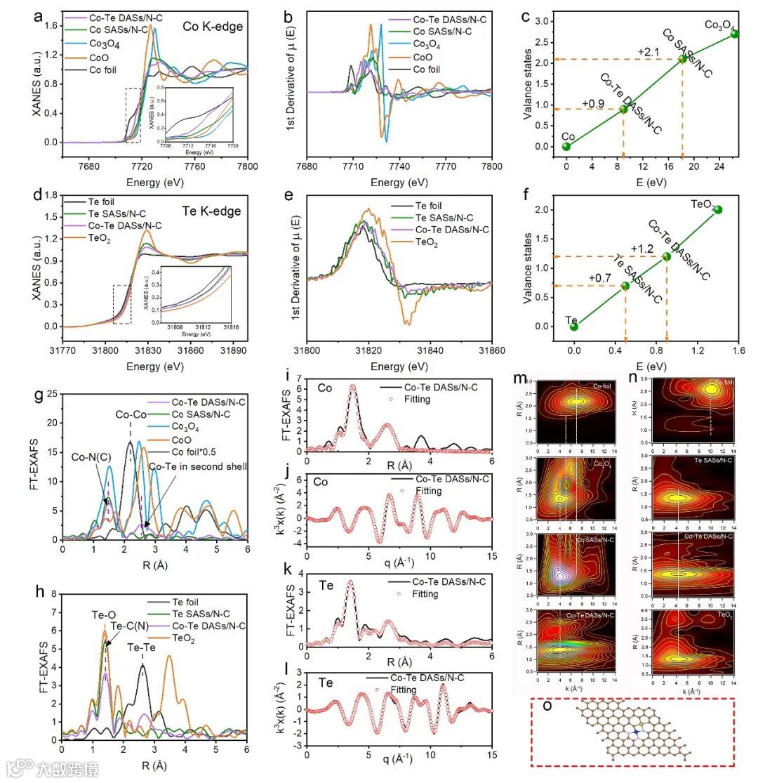 图2 a,d)Co K-edge和Te K-edge的XANES,b,e)Co K-edge和Te K-edge的一阶导数,c,f)XANES光谱拟合的Co和Te的平均氧化态,g,h)Co和Te在R空间的傅里叶变换光谱,i)R和q空间的EXAFS拟合图,m,n)小波变换图,o) Co-Te DASs/N-C的结构模型。