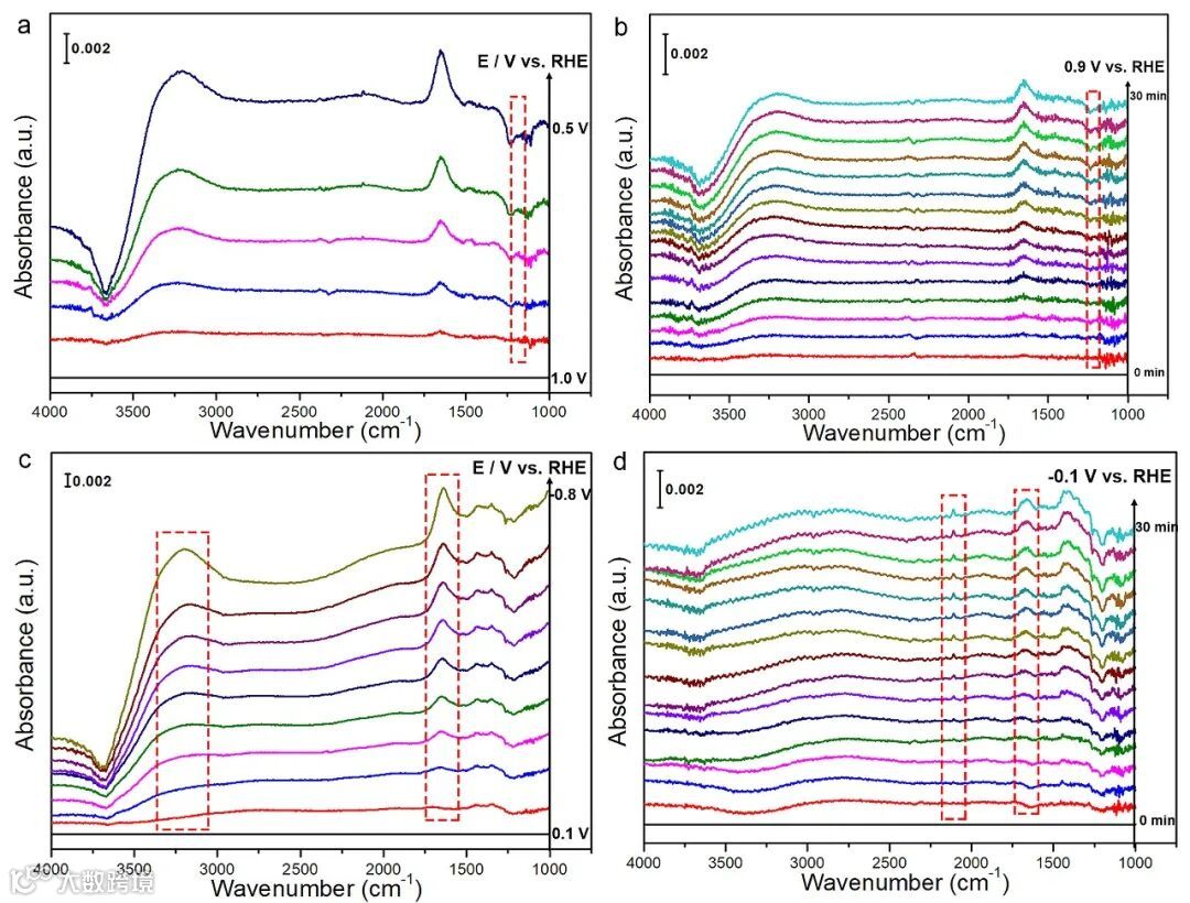 图4 Co-Te DASs/N-C的原位红外光谱,a,b)ORR在O2饱和的0.1 M KOH中,c,d)HER在N2饱和的1 M KOH中。