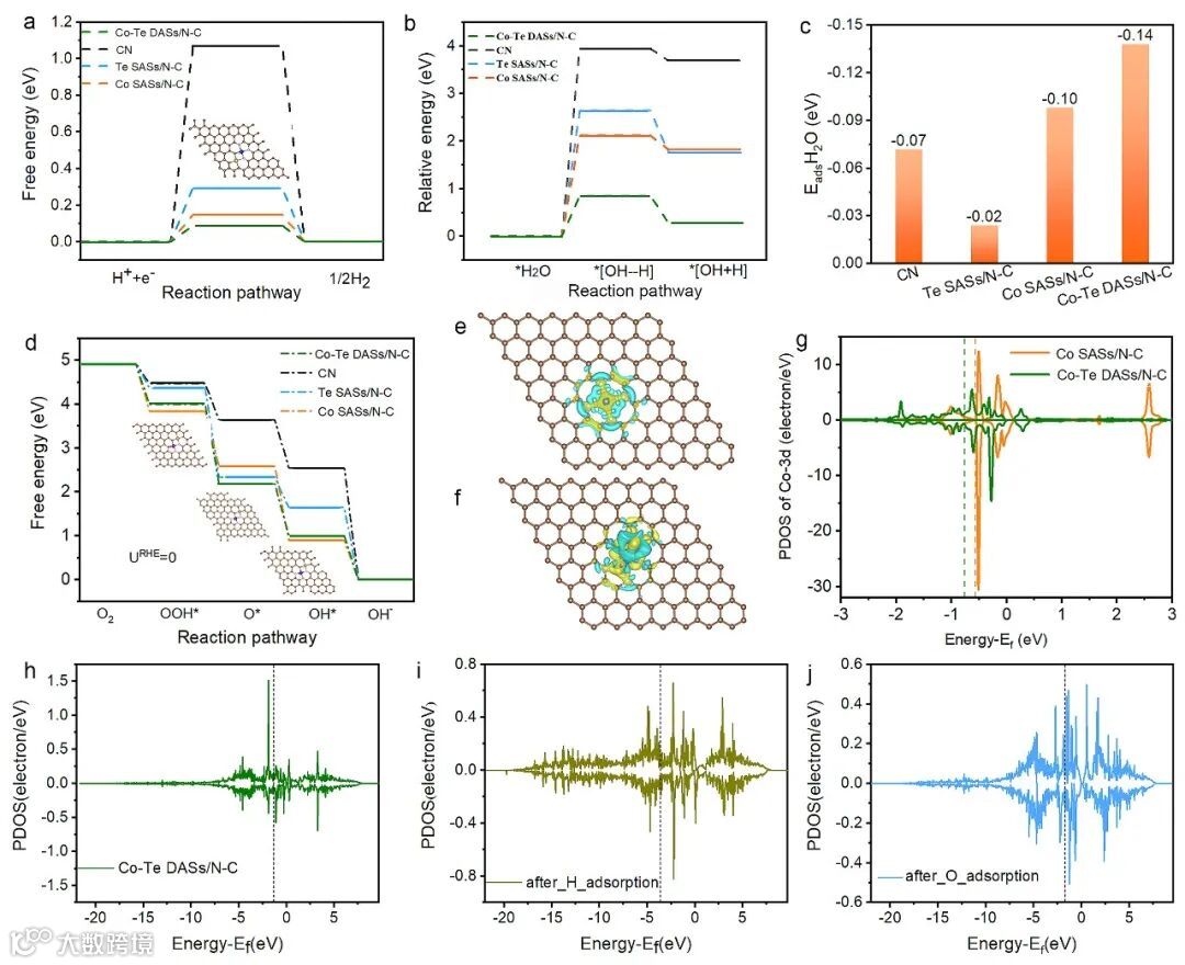 图5 a)不同催化剂在酸性HER过程中的ΔGH*,b)H2O分子的解离反应能垒图,c)H2O吸附能,d)ORR自由能图,e)Co SASs/N-C的差分电荷密度图,f)Co-Te DASs/N-C的差分电荷密度图,g)Co原子3d轨道的PDOS图,Co-Te DASs/N-C中游离位(h)、H吸附后(i)和O吸附后(j)C原子最靠近Co原子的2p轨道的PDOS图。