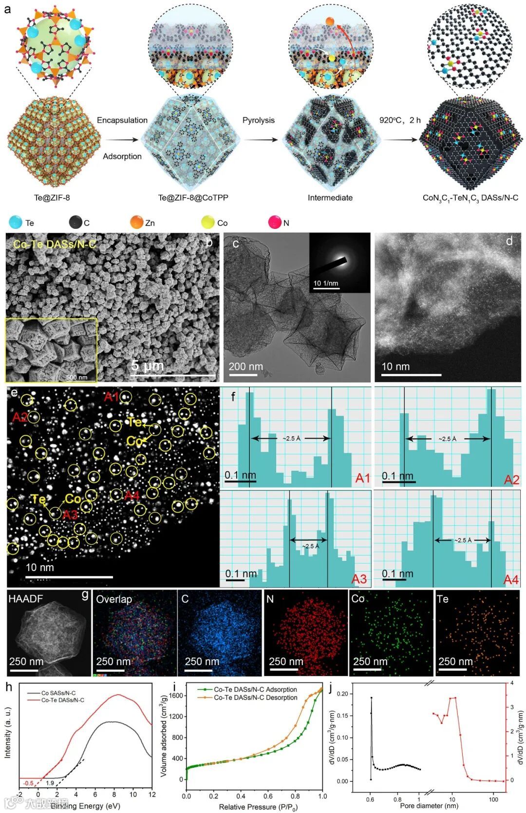 基于分子工程概念,利用掺杂-吸附-热解策略成功合成了N掺杂碳锚定的CoN3C1-TeN1C3双原子位点催化剂。首先,将Te原子封装在ZnCo@ZIF-8的笼子中,再利用π-π共轭在表面吸附一层四苯基卟啉钴分子构筑一个类似“三明治”的结构,最后经高温热解,Zn原子挥发,同时Co原子由外层向内迁移被N和C原子锚定,Te原子由内层向外迁移被N和C原子锚定,得到Co-Te双原子位点催化剂。