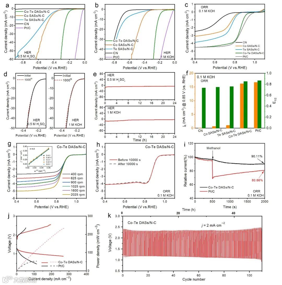 图3 HER LSV曲线在a)0.5 M H2SO4,b)1 M KOH,c)在0.1 M KOH中的ORR LSV曲线,d)稳定性测试前后的LSV曲线,e)i-t曲线,f)0.85 V下的jk及E1/2,g)不同转速的LSV曲线,h)ORR稳定性测试前后的LSV曲线,i)抗甲醇稳定性,j)充放电极化曲线和功率密度图,k)充放电循环性能。
